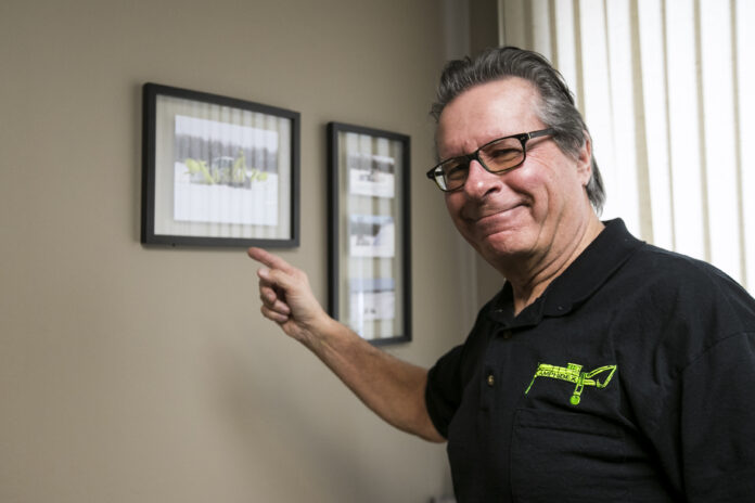 Selkirk mayor Larry Johannson held a photo of a 24-ton amphibex machine while he reflected on the ice mitigation program in the Selkirk area.