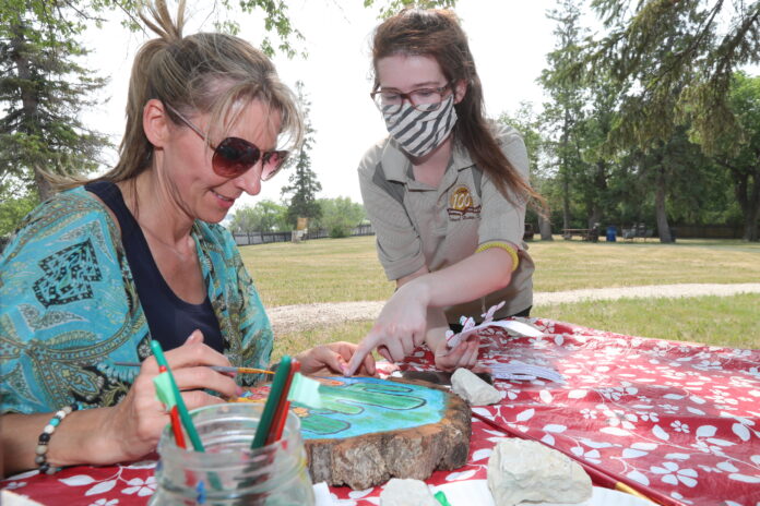 St. Andrews historical interpreter Belle Lourenco talks to Linda Thompson about her painting during the adult wood slice painting class at the St. Andrews Rectory in the RM of St. Andrews, Man., on Saturday, July 17, 2021. (Brook Jones/Selkirk Settler Times)